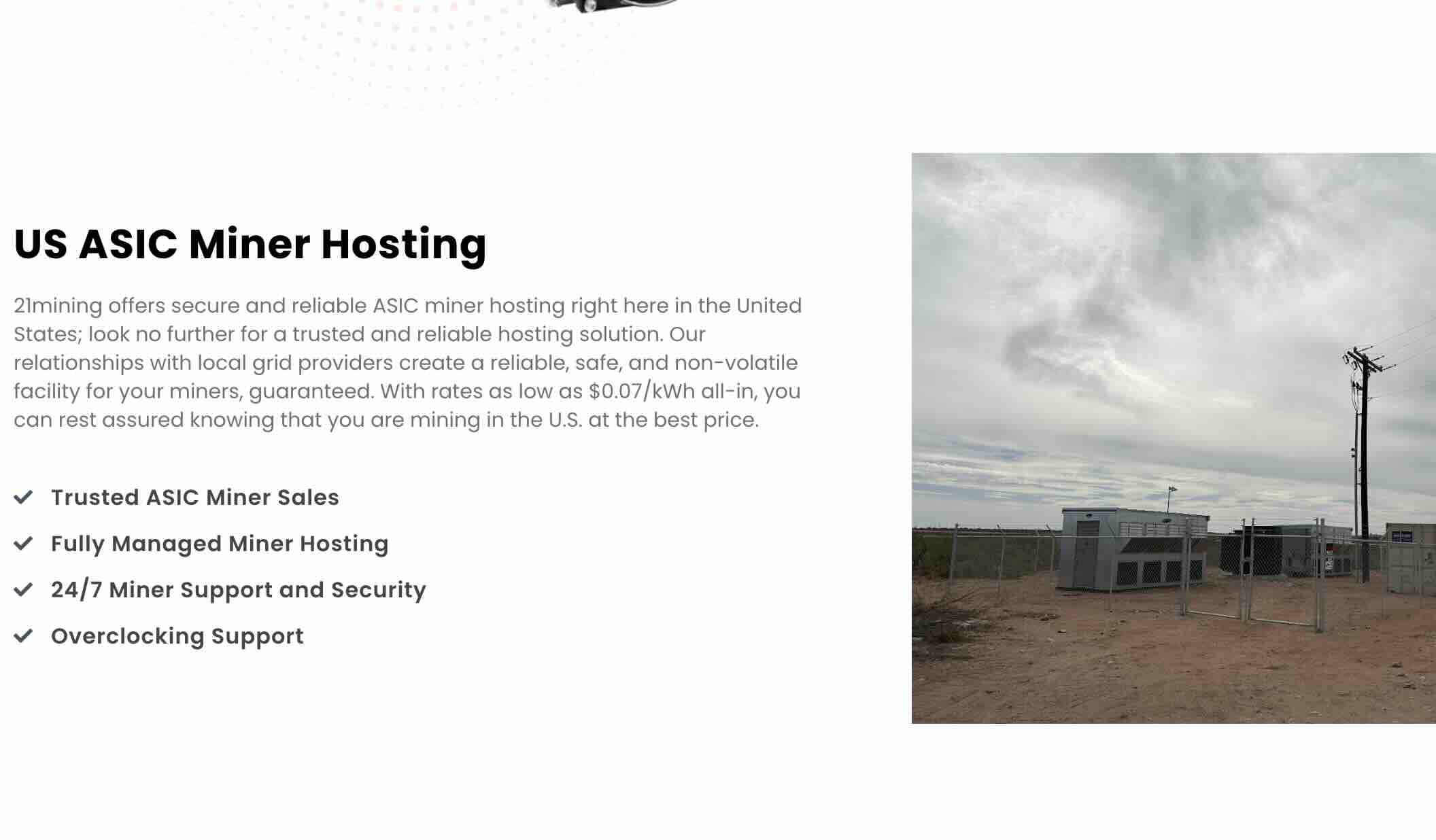 21 Mining is a Bitcoin cloud mining and hosting platform that allows users to mine cryptocurrency without purchasing and maintaining their own hardware. The service operates mining facilities where they host ASIC miners on behalf of customers, handling everything from electricity costs to cooling and maintenance.