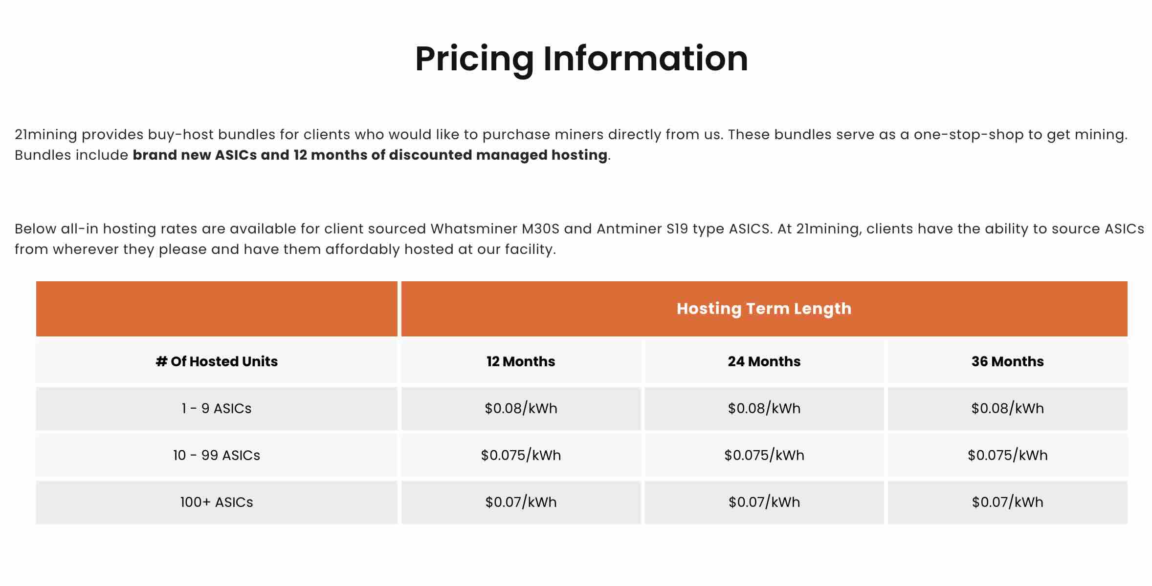 21 Mining offers a unique hosting model where they provide buy-host bundles that include brand new ASICs and 12 months of discounted managed hosting. This is a one-stop-shop approach to get mining without the complexity of sourcing hardware and hosting separately.