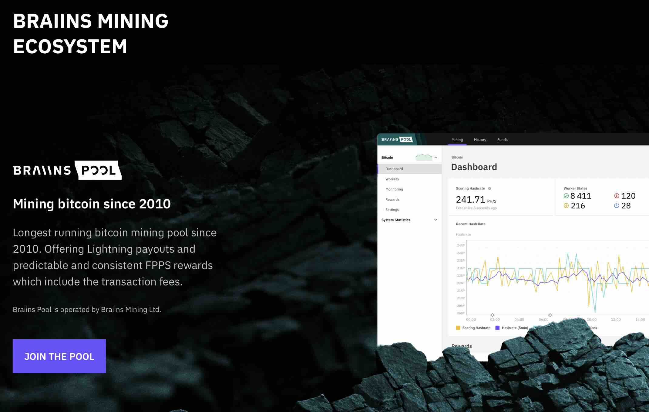Braiins Pool is the world's oldest active Bitcoin mining pool, having mined its first block in November 2010. Originally launched as "Bitcoin.cz Mining Pool" and later rebranded from Slush Pool, it has mined over 1.3 million BTC and currently maintains 5-8% of the Bitcoin network's total hash rate.