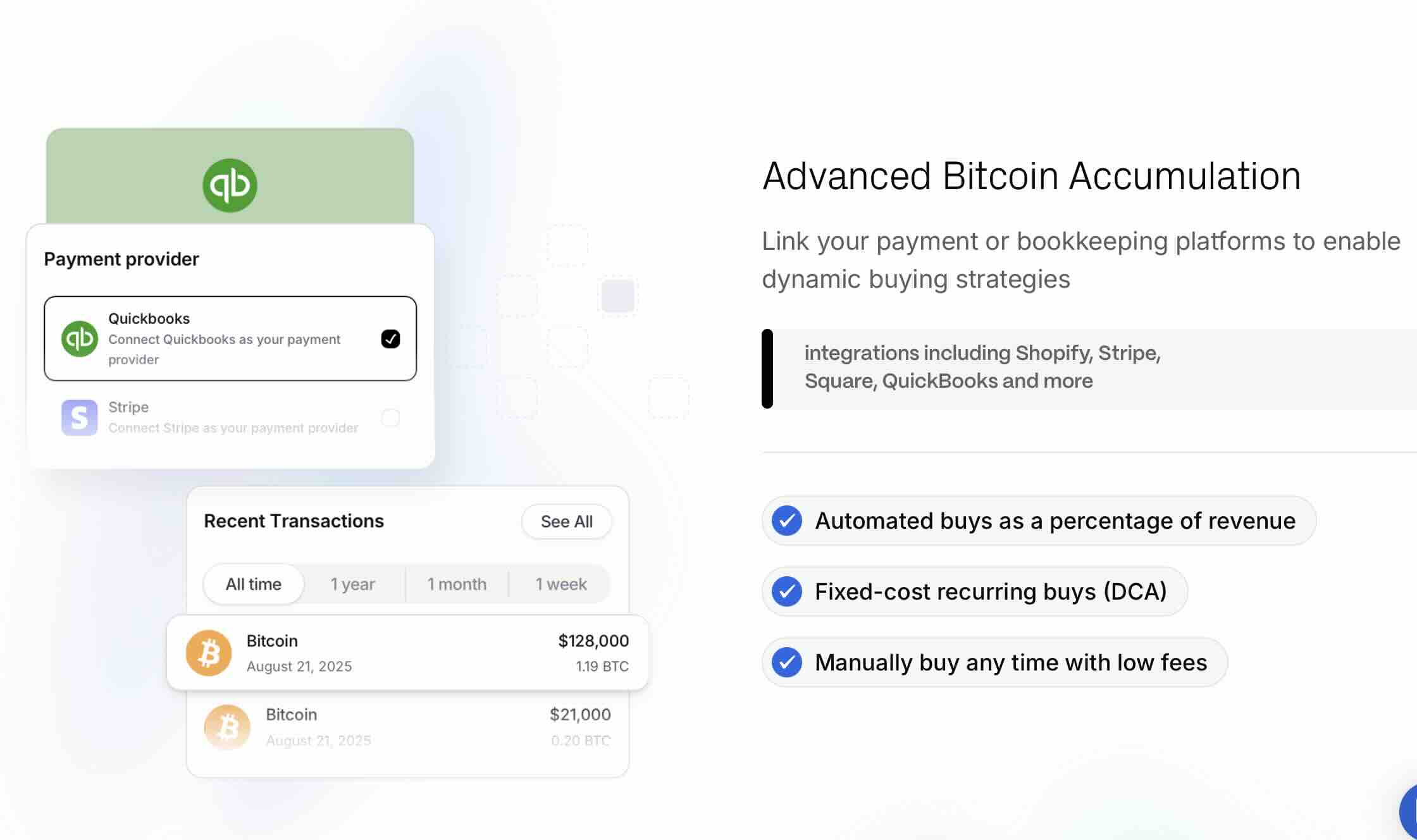 Castle bridges the gap between traditional business operations and Bitcoin savings through smart automation. Rather than requiring business owners to manually purchase Bitcoin or manage separate cryptocurrency accounts, Castle integrates directly with existing payment processors and accounting systems.