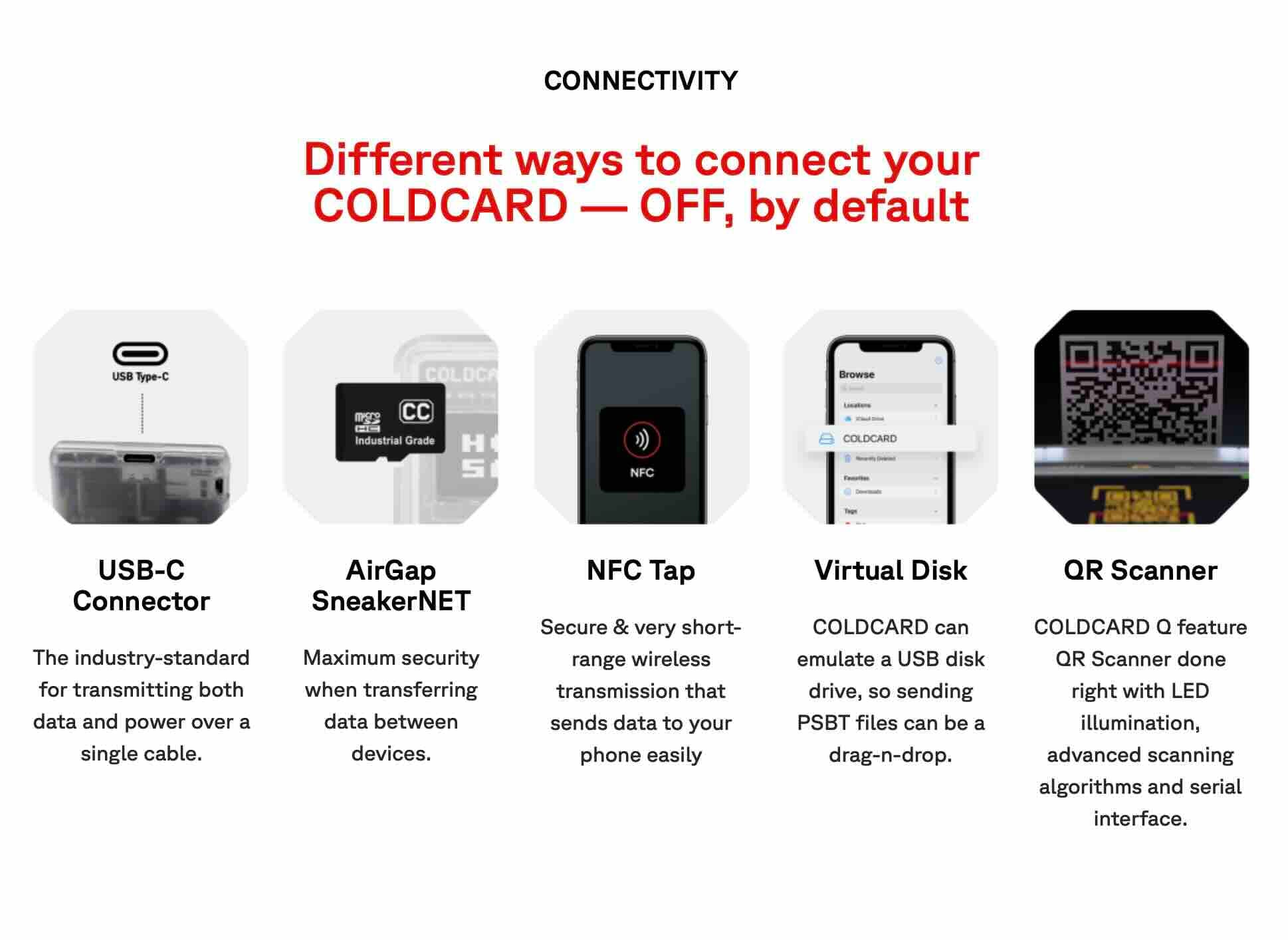 - MicroSD card: Sign transactions offline by physically moving files between your computer and Coldcard