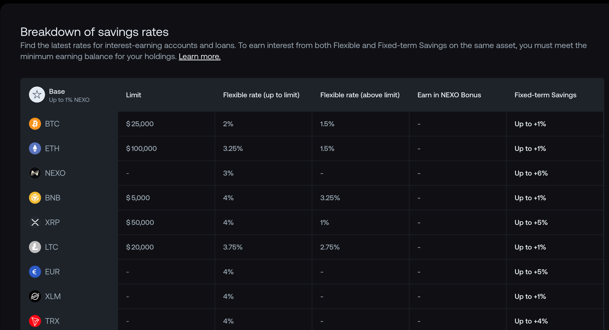 Looking at Nexo's current savings breakdown, here's what you're actually looking at for Bitcoin:
