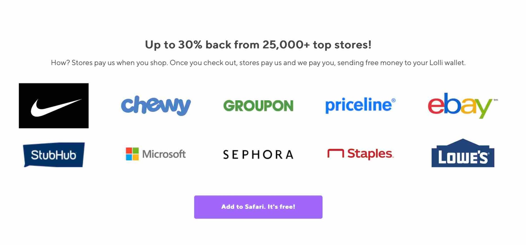 Lolli's strength lies in its extensive network of over 25,000 participating merchants spanning virtually every shopping category imaginable. Major partners include household names like Nike, Microsoft, Sephora, eBay, Priceline, Groupon, Staples, and Lowe's, among thousands of others.