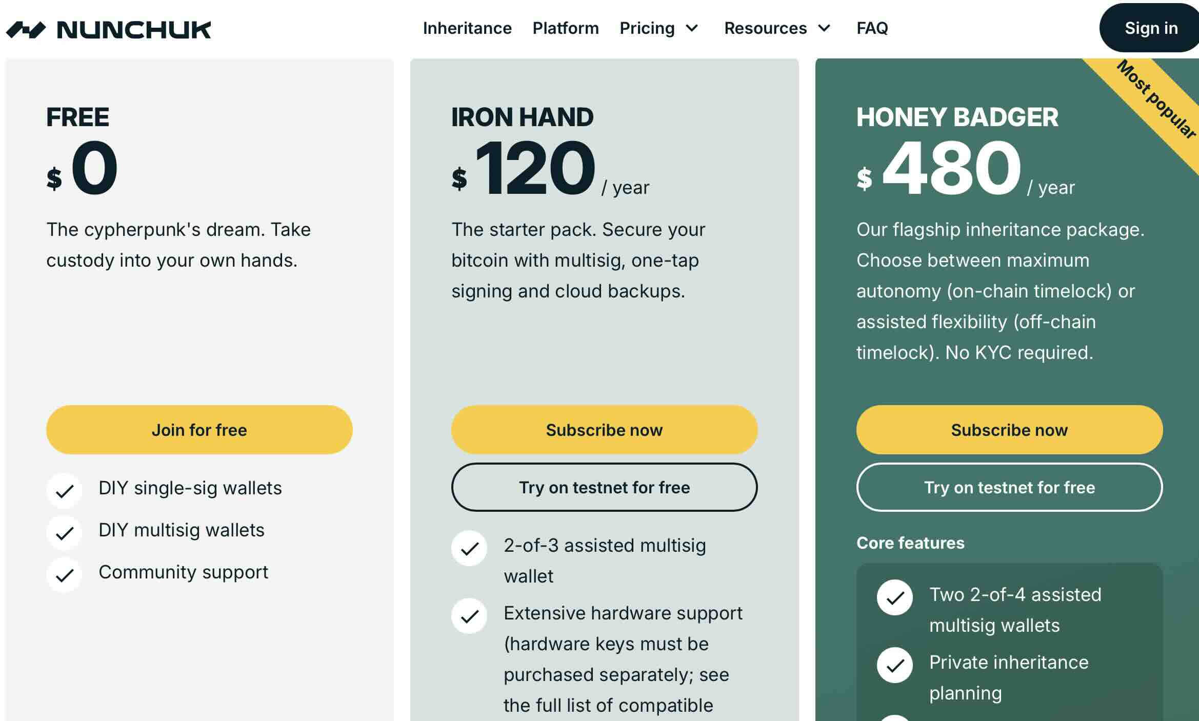Nunchuk offers a genuinely free tier alongside two paid subscription options: