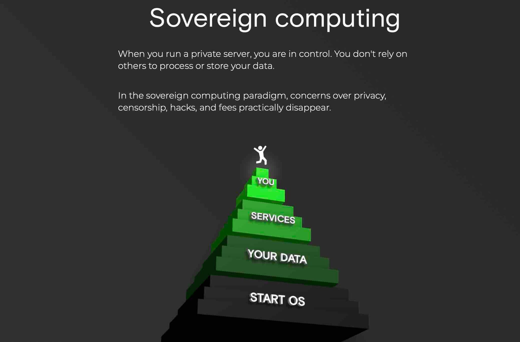 Start9 articulates a clear philosophical distinction between cloud computing and sovereign computing. Their pyramid diagrams effectively illustrate this difference. In the cloud computing model, users sit at the bottom of an inverted pyramid, supporting the weight of intermediary services above them. In sovereign computing, the pyramid rights itself, with StartOS providing the foundation for user empowerment.